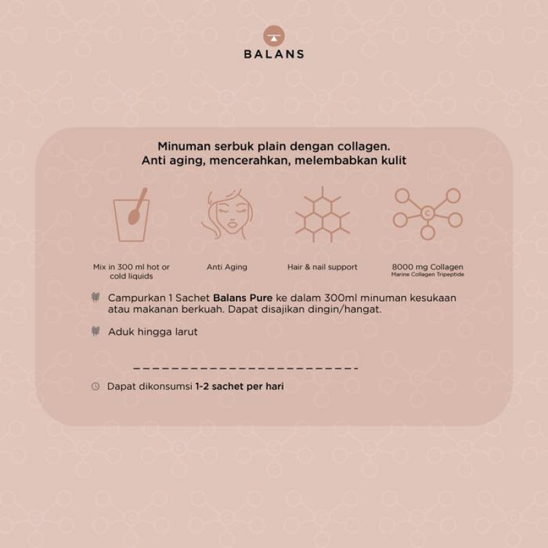 Petunjuk Penyajian : Campurkan 1 sachet Balans Pure ke dalam 300ml minuman / makanan berkuah pilihan Anda. Dapat disajikan dingin/hangat. Disarankan 1-2 sachet/hari