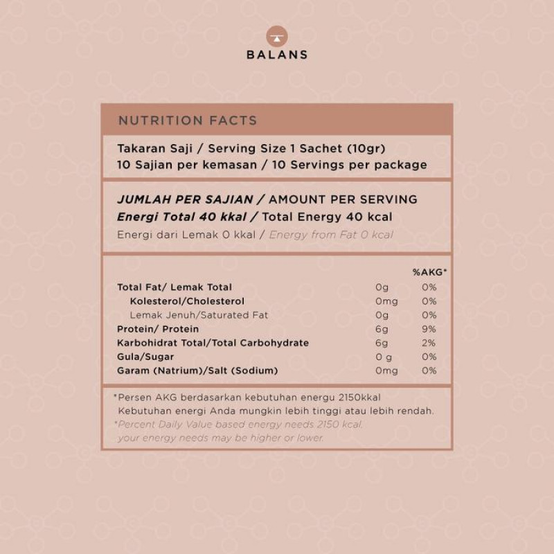 - Menggunakan “Collagen Tripeptide” yang merupakan partikel/molekul kolagen yang lebih kecil dari Collagen Peptide (Hydrolized Collagen) sehingga membuat Balans Pure 3x lebih mudah diserap tubuh.