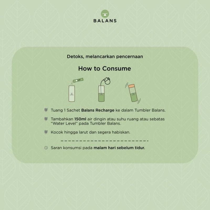 Saran Konsumsi: Balans Recharge dapat diminum malam sebelum tidur. Cara Penyajian: Tuang 1 sachet Balans Recharge dalam botol berisi dengan 150 ml air biasa/air dingin, lalu kocok hingga larut.