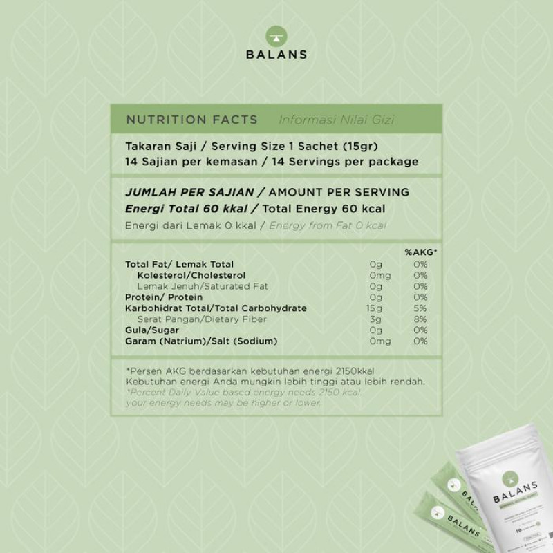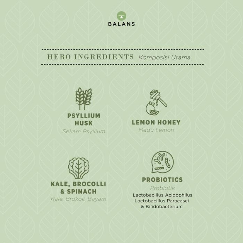 BALANS terbuat dari serat alami dan diformulasikan dengan probiotics, prebiotics, digestive enzymes, dan vitamin yang menjaga kesehatan pencernaan.