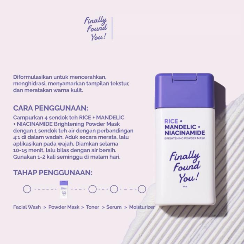 masker bubuk eksfoliasi lembut yang menggabungkan Ekstrak Beras, Asam Mandelic, dan Niacinamide untuk mencerahkan, meratakan warna kulit, memperbaiki tekstur, serta menghidrasi, menjadikannya cocok untuk pengalaman perawatan kulit yang menyenangkan dan efektif merawat kulit kusam tanpa iritasi.