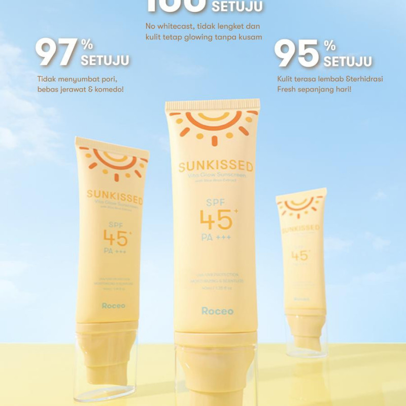 Berikan proteksi maksimal dari sinar UVA & UVB dengan Roceo Sunkissed Vita Glow Sunscreen SPF 45 PA+++. Formula ringan, tanpa whitecast, dan rasa lengket. Dengan kandungan dari Rice Bran Extract yang kaya vitamin E bantu mengontrol minyak berlebih di wajah, untuk kulit cerah dan tampak bercahaya.