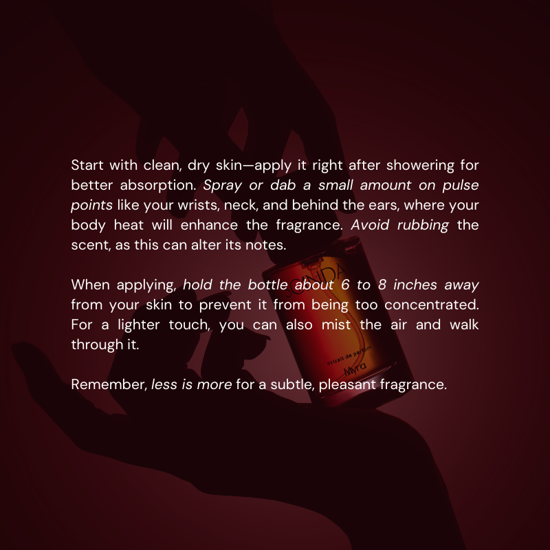 - Semprot parfum dari jarak 10-15cm - Pakai di bagian titik2 nadi seperti leher dan telapak tangan