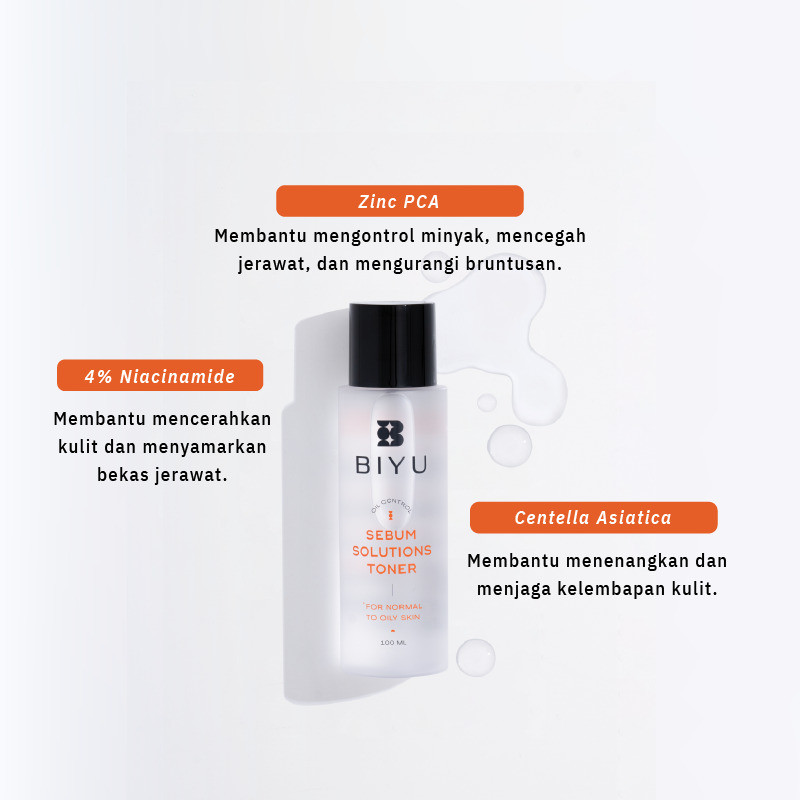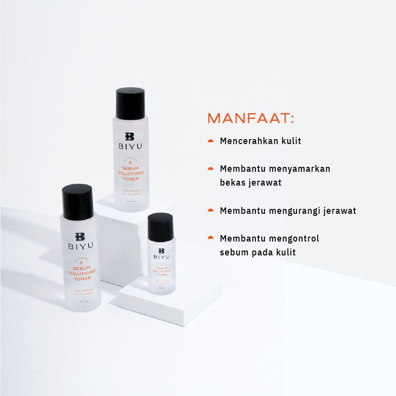Sebum Solutions Toner merupakan toner yang diformulasikan untuk mencerahkan kulit wajah, melawan bakteri penyebab jerawat serta membantu mengontrol sebum pada kuli. Cocok untuk kulit sensitif, normal, kombinasi, dan berminyak. Tersedia dalam ukuran 100ml dan 30ml.
