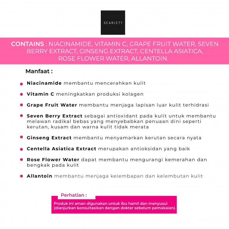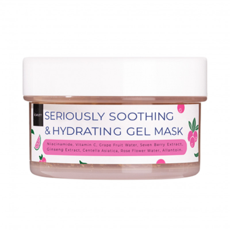 Scarlett Seriously Soothing & Hydrating Gel Mask dapat digunakan untuk merawat kulit kering, kusam, iritasi, dan sensitif. Di dalam Scarlett Seriously Soothing & Hydrating Gel Mask terdapat kandungan Niacinamide, Vitamin C, Grape Fruit Water, Seven Berry Extract, Ginseng Extract, Centella Asiatica, Rose Flower Water, Allantoin yang bermanfaat sebagai: