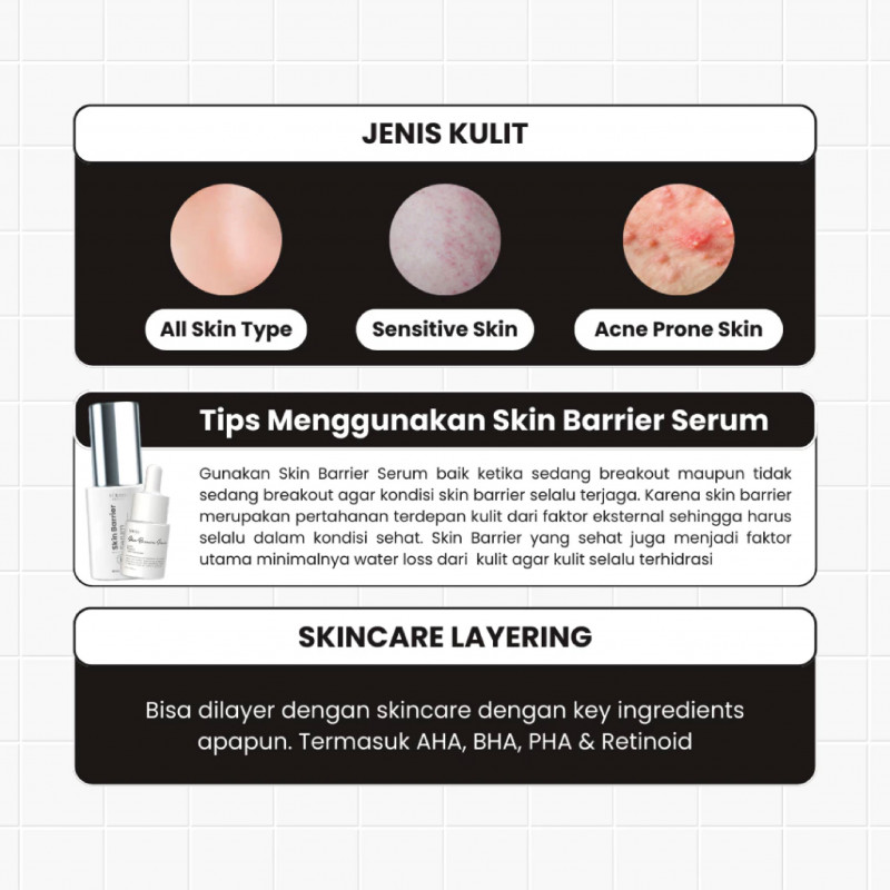 Skin Barrier Serum adalah serum yang diformulasikan untuk menyembuhkan skin barrier yang rusak, meredakan kemerahan akibat iritasi, menyamarkan dark spots sekaligus mencerahkan, menutrisi, dan melembutkan kulit