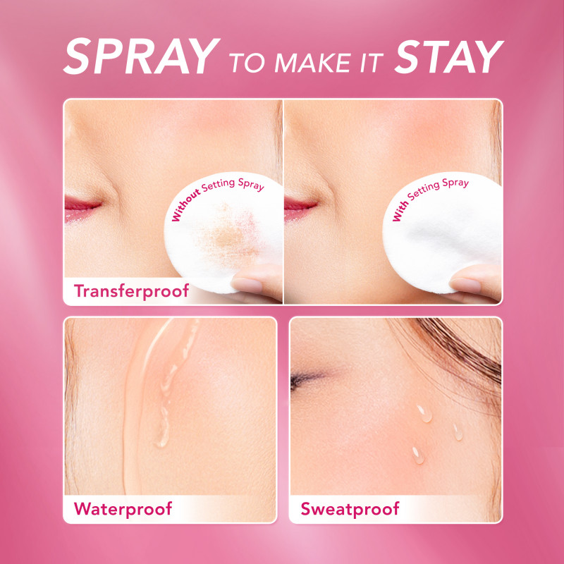 Sebelum dan setelah makeup, kocok botol dan pegang sejauh 20-25 sentimeter dari wajah dan semprotkan dalam formasi "X" dan "T".