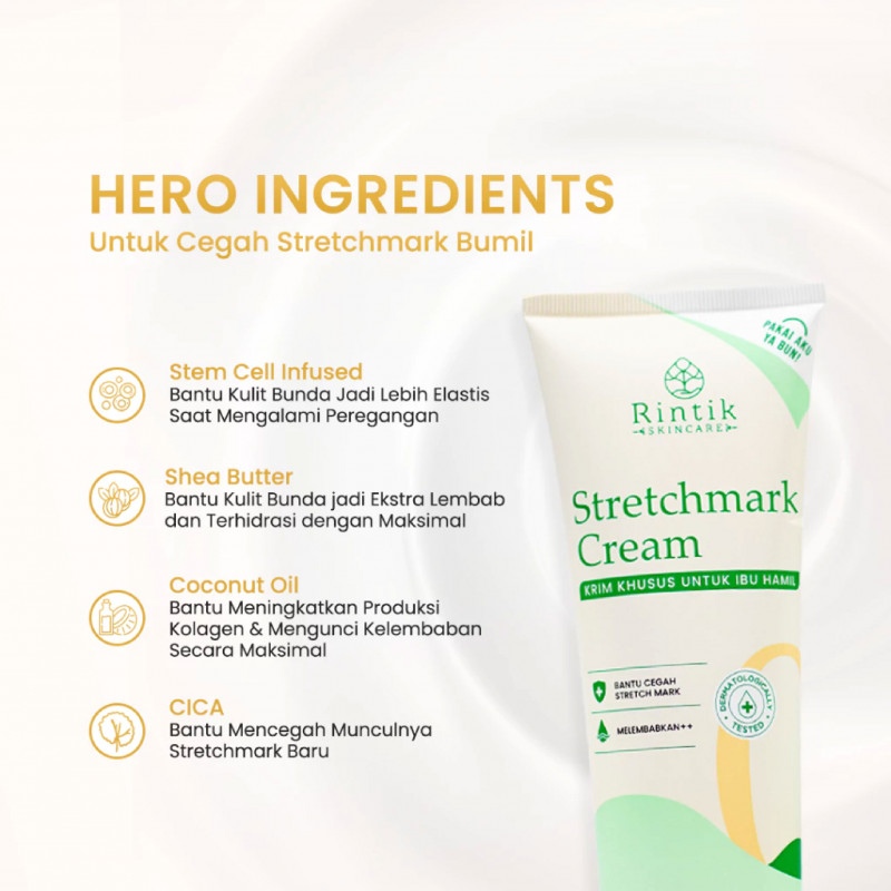 Rintik Stretchmark Cream adalah solusi perawatan kulit yang dirancang untuk melembabkan secara maksimal, meningkatkan elastisitas kulit, dan meminimalisir munculnya stretch mark selama kehamilan.