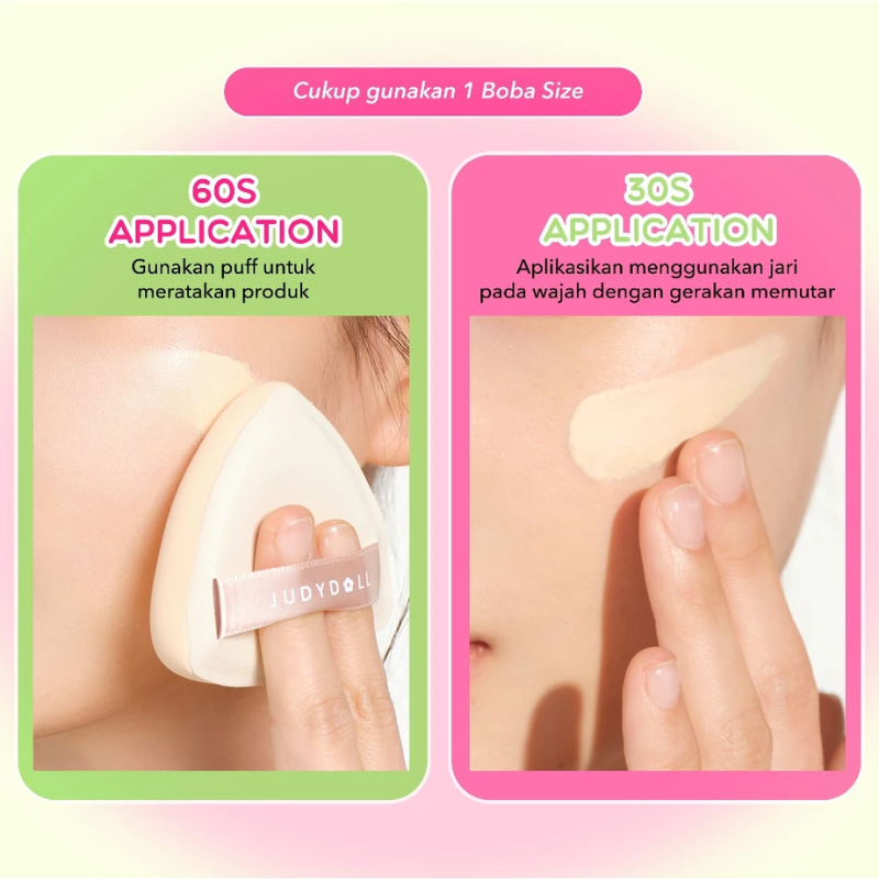 Keluarkan produk sebanyak 1 boba size Ratakan pada wajah menggunakan jari Gunakan jari atau sponge untuk meratakan pada seluruh wajah Tambahkan produk jika merasa diperlukan