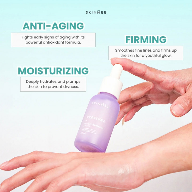 Skinmee Treasure Perfect Radiance Serum adalah serum 8 in 1 mengandung bahan aktif yang berfungsi untuk membantu menjaga kesehatan kulit. Serta meningkatkan produksi kolagen yang bermanfaat untuk memperbaiki tekstur kulit dan menyamarkan garis-garis halus atau kerutan. Serum ringan ini mengandung probiotic fractions. seperti Lactococcus Ferment, Bifida Ferment Lysate, Vitamin C, Albatrellus Ovinus Extract, Hyaluronic Acid, Niacinamide & Lactic Acid yang juga bermanfaat agar kulit wajah Anda tetap cerah bercahaya dan memperkuat fungsi pelindung kulit wajah Anda.