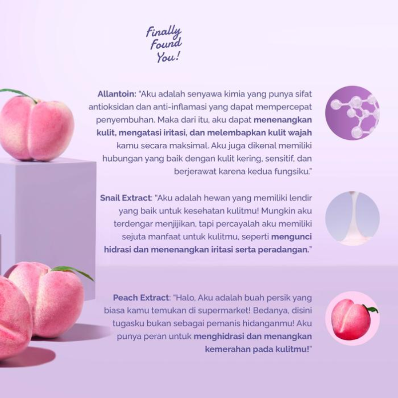 Diformulasikan dengan 2% Panthenol (Vitamin B5), Cyanocobalamin (Vitamin B12), Allantoin, Snail Extract, and Peach Extract yang mampu menenangkan kulit, meredakan kemerahan dan menjaga kekuatan skin-barrier.Selain itu, kandungan aktif seperti 5% Niacinamide (Vitamin B3) dapat membuat kulit wajah tampak sehat, cerah dan bercahaya.