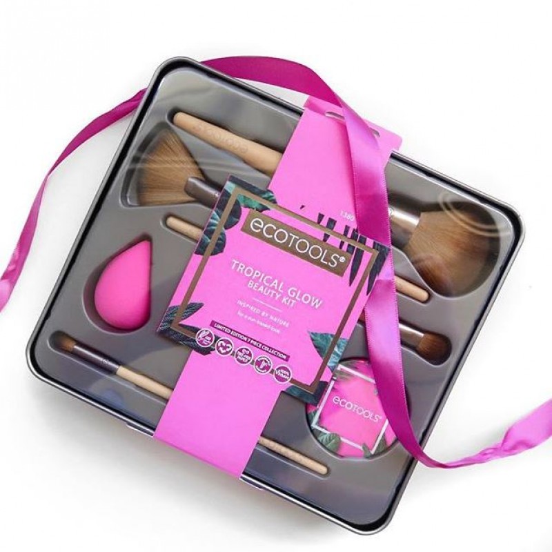 The Tropical Glow Beauty Kit includes a unique collection of 4 brushes, a travel blender, compact mirror and reusable steel tin to create a fresh tropical glow wherever your travels take you.