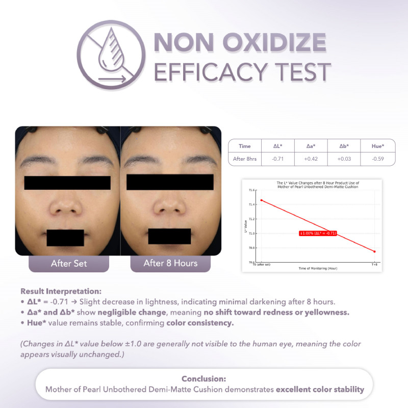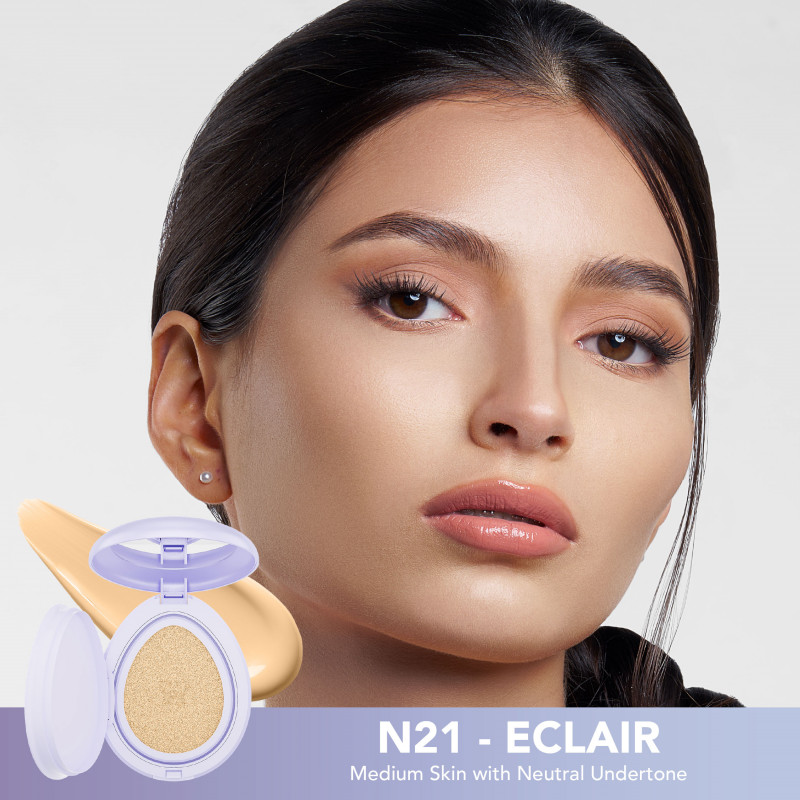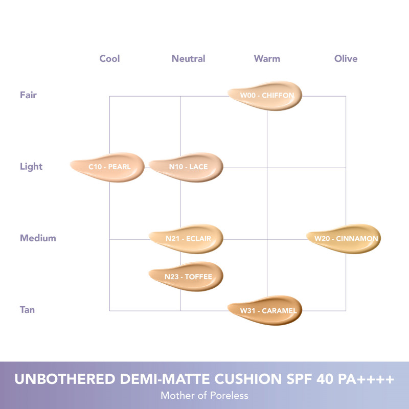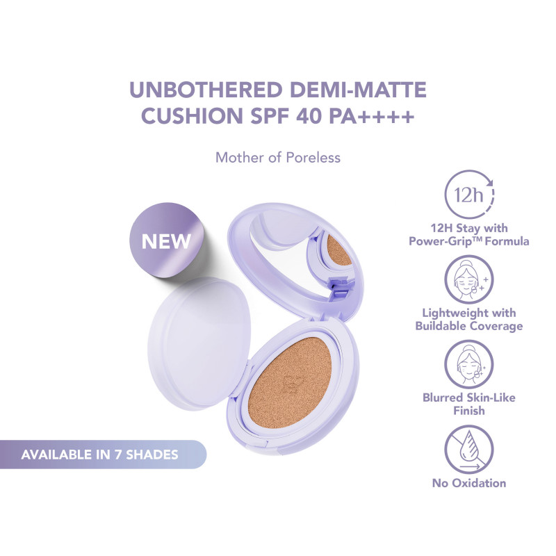 The Unbothered Demi-Matte Cushion offers medium to full coverage with SPF 40 PA++++ in a lightweight, creamy formula that feels like second skin. Powered by Xfine Technology, it delivers a blendable, buildable texture that melts seamlessly into the complexion for a blurred skin effect—blurring pores, minimizing redness, and controlling shine for a smooth, skin-like finish with a healthy demi-matte glow. With no oxidation and a Power-Grip formula for long-lasting wear, it’s the perfect match for normal to oily skin types to stay fresh, polished, and confidently radiant all day long.