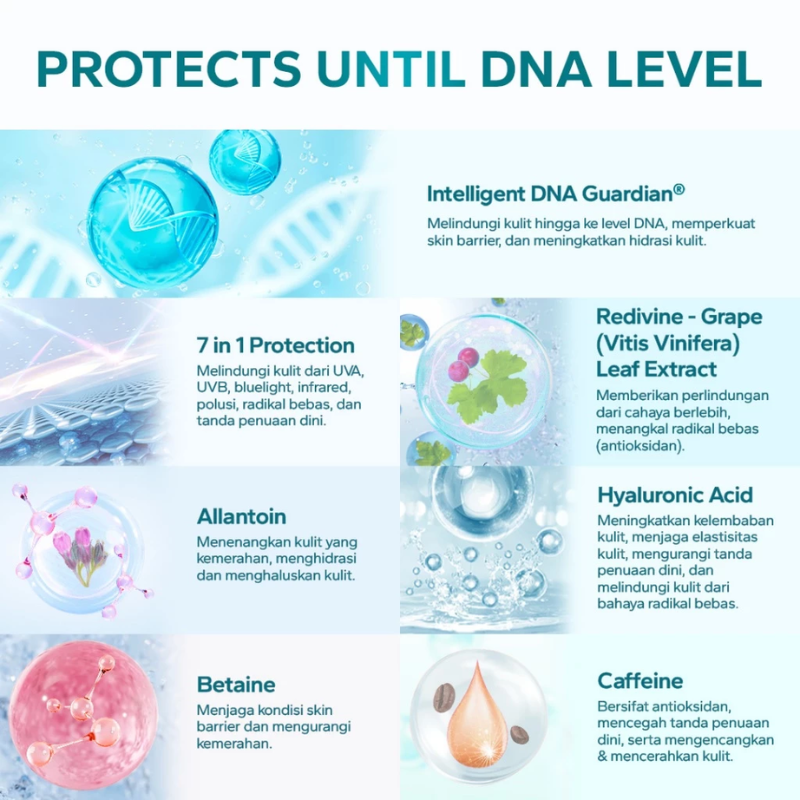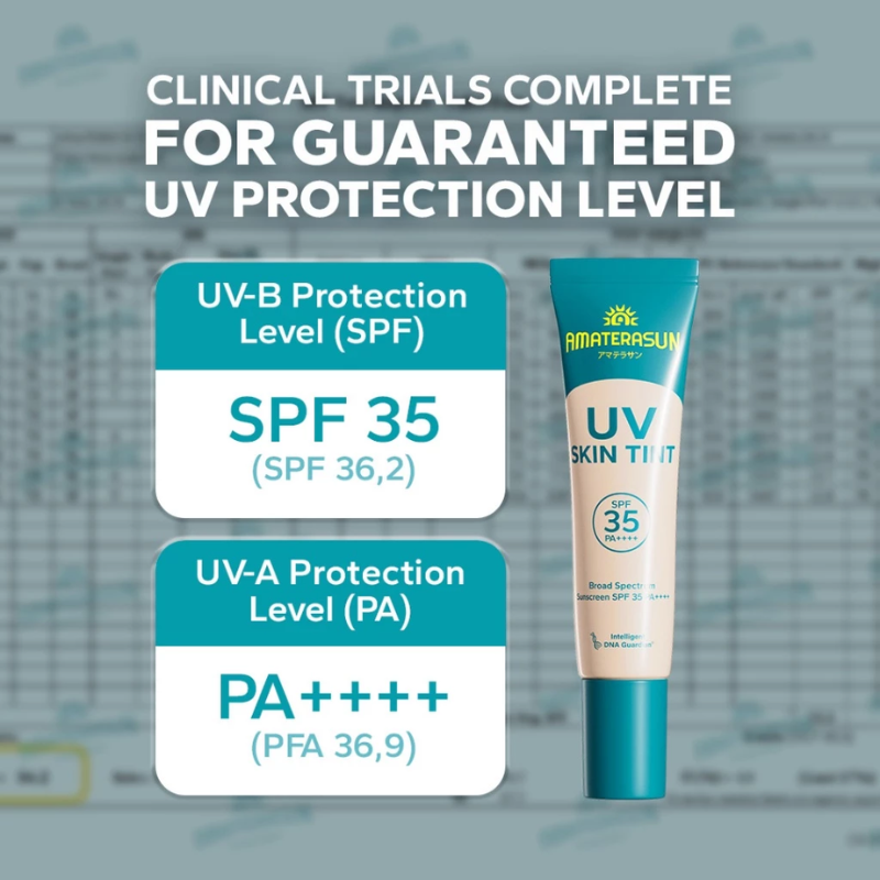 Skin tint SPF 35 PA++++ dengan kandungan antioksidan & skincare-infused. Dilengkapi dengan tekstur se-ringan air & Intelligent DNA Guardian yang melindungi barrier kulit dari UVA, UVB, blue light, polusi, radikal bebas, penuaan dini & kerusakan DNA Amaterasun UV Skin Tint memberikan finish kulit sehat bercahaya tanpa membuat pori tersumbat. Dapat digunakan semua jenis kulit, termasuk sensitif & acne-prone. Dermatology tested, fragrance free, for daily use, from 11 y.o