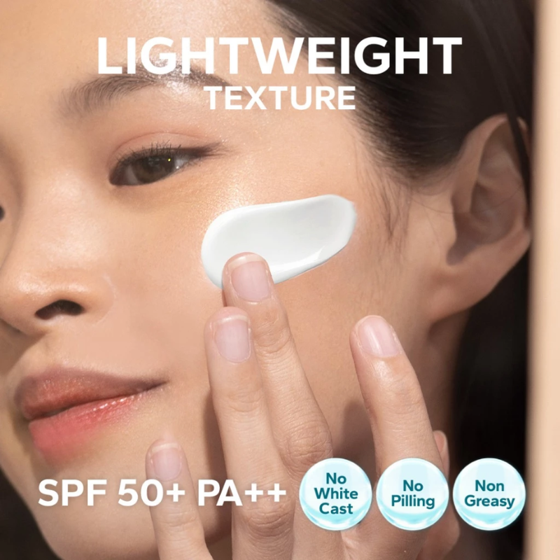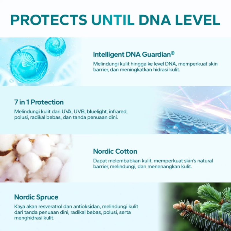 7-in-1 Vegan Sunscreen Serum dengan SPF 50+ PA++ & dry-touch finish. Dilengkapi dengan Intelligent DNA Guardian庐 (by AMATERASUN) yang melindungi kulit dari paparan sinar UVA, UVB, kerusakan DNA kulit, blue-light, radikal bebas, polusi & minyak berlebih. Nyaman digunakan setiap hari, tidak lengket, tidak white cast, pilling & meninggalkan residu putih. Cocok untuk kulit kombinasi - berminyak