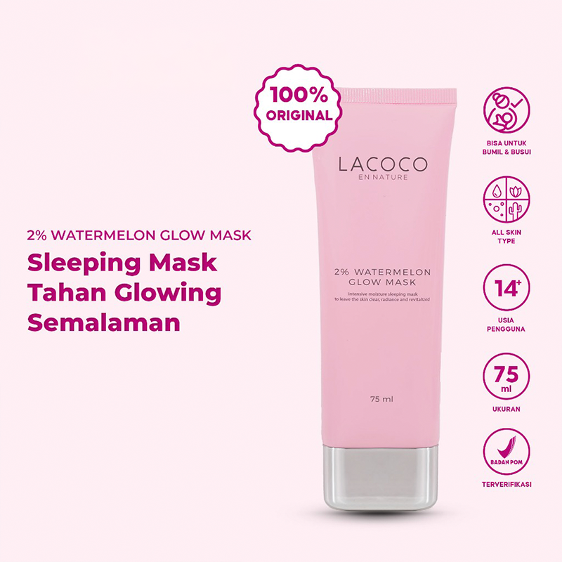 Watermelon Glow Mask merupakan sleeping mask yang digunakan pada rangkaian terakhir perawatan wajah di malam hari. Diformulasikan dengan ekstrak semangka, pisang, dan rumput laut, masker ini dapat membantu membuat wajah terlihat lebih cerah dan berkilau di pagi hari. Dilengkapi dengan PGA dan lactic acid yang dapat menghidrasi wajah secara intensif, menenangkan kulit, mengurangi iritasi dan kemerahan. Pemakaian secara rutin dapat membantu memudarkan bekas jerawat, flek hitam, dan mencegah tanda penuaan.