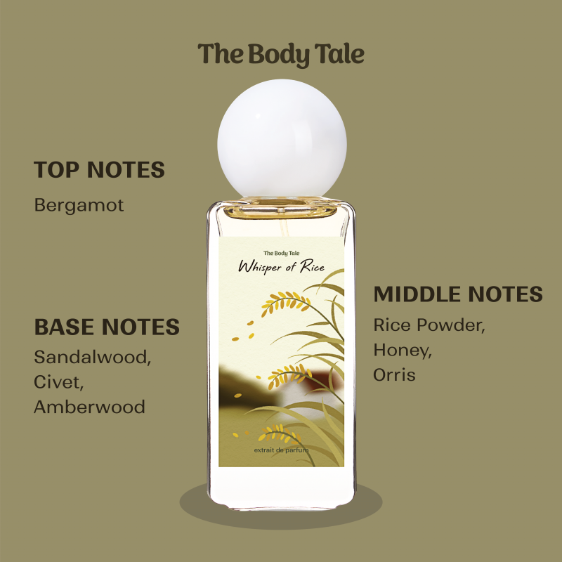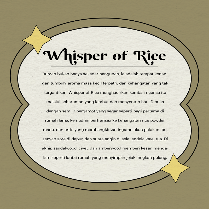 Whisper of Rice is a fragrance that captures the warmth, calmness, and familiarity of home ” Inspired by the subtle scent of rice fields, sun-drenched mornings, and quiet reflections, this perfume wraps the wearer in an invisible comfort — like the scent of nostalgia and the softness of belonging.